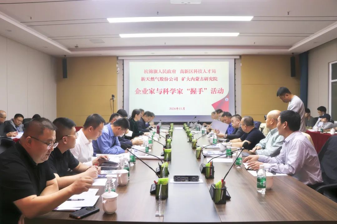 11月1日,由高新区科技人才局联合杭锦旗人民政府组织新疆鑫泰天然气股份有限公司、中国矿业大学(北京)内蒙古研究院开展的企业家与科学家“握手”活动在内蒙古研究院举办。杭锦旗旗委副书记、政府旗长、杭锦旗经济开发区党工委书记张仲平,杭锦旗委常委、政府副旗长王广平,新疆鑫泰天然气股份有限公司董事长明再远,内蒙古研究院执行院长王国勇,内蒙古研究院深部煤制气科研团队及杭锦旗政府领导、相关职能部门负责人参加活动。